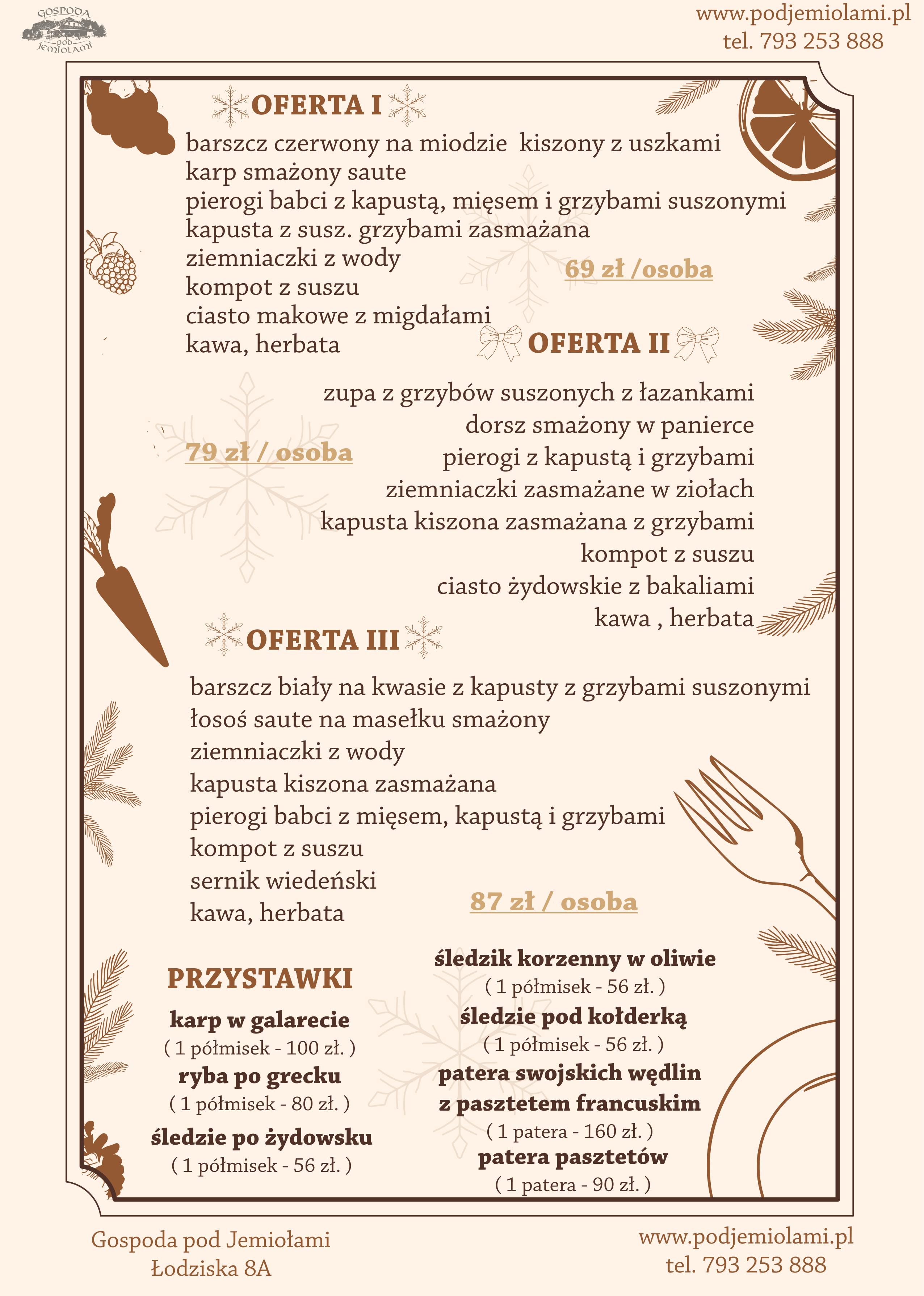 Skontaktujcie się z nami (tel. 793 253 888), aby omówić szczegóły i specjalne życzenia. Czekamy, aby uczynić Wasze firmowe Wigilie niezapomnianymi!
